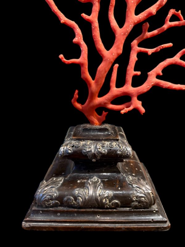 Oggetto di grande impatto visivo il Corallo è sempre stato considerato un oggetto da grande collezione, questo grande ramo montato su una base veneziana di noce e urbanizzata e i Impreziosita con fregi d'argento È quindi un oggetto di grande impatto ed unico per chi vuole il impreziosire la propria collezione.