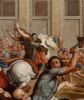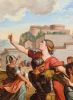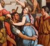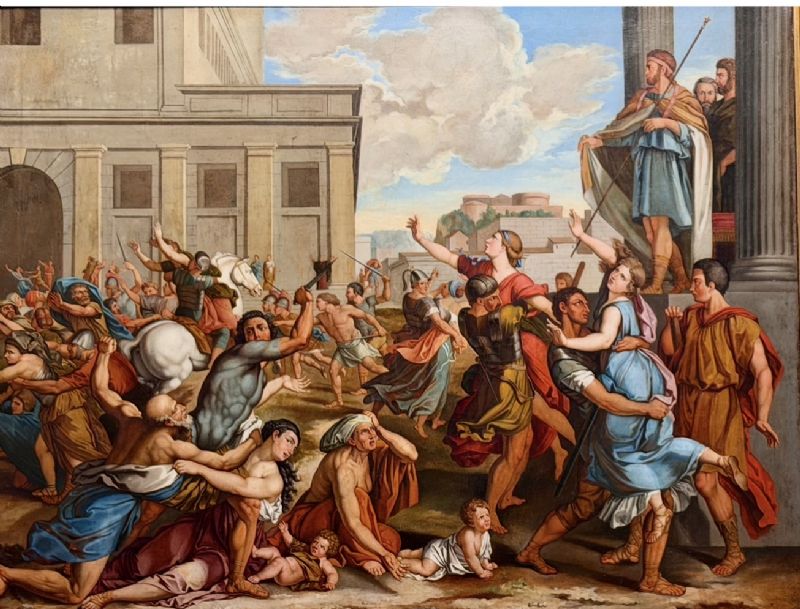 Il "Ratto delle Sabine" è un episodio della mitologia romana che racconta il rapimento delle donne sabine da parte dei Romani, un atto che simboleggia la nascita della civiltà romana. Questo tema ha affascinato artisti del XVII e XVIII secolo, tra cui Nicolas Poussin, Giovanni Battista Tiepolo e Jacques-Louis David, grazie al suo grande impatto visivo e narrativo. Il dipinto neoclassico che presentiamo cattura appieno questa forza espressiva, grazie a una tavolozza ricca e vibrante che esalta l'eleganza dei soggetti. Le figure, con le loro pose dinamiche e la straordinaria attenzione ai dettagli, riflettono un ideale di bellezza e armonia tipico dell'epoca, rendendo l'opera un capolavoro di intensa emozione e raffinatezza.