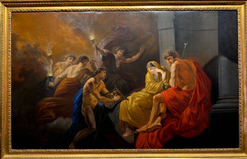 Presentiamo ora un straordinario dipinto neoclassico che narra il mito di Morfeo, il dio dei sogni, e il suo amore per Euridice. Morfeo, con la sua lira, si presenta dinanzi ad Ade, il dio degli inferi, per implorarlo di far tornare in vita Euridice, morta a causa del morso di un serpente. Questo dipinto non solo si distingue per la qualità tecnica e la vivacità cromatica, ma esprime anche un'intensa carica emotiva. La scena raffigura Morfeo immerso in un'atmosfera onirica e sensuale mentre supplica Ade, toccando i temi più intimi e appassionati dell'amore. L'opera celebra la forza indomita dei legami affettivi, che trascendono la vita e la morte, e invita lo spettatore a riflettere sull'importanza dell’amore, un tema universale e senza tempo, capace di rimanere vivo anche nei sogni più profondi.
