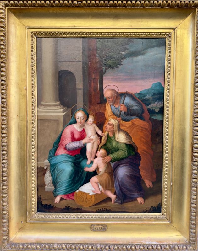 Sainte Famille sur Panneau en parfait état de conservation, dimensions 72 × 53 centimètres, portant une étiquette "Perin Del Vago". Le tableau est orné d'un beau cadre d'époque néoclassique, également en parfait état de conservation.